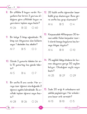 8. Bir çiftlikte 8 koyun vardır. Ko- 12. 20 kişilik sınıfta öğrenciler beşer