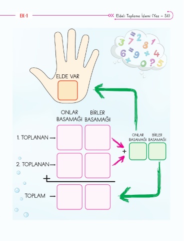 EK-1 Eldeli Toplama İşlemi (Yaz - Sil) ELDE VAR ONLAR BİRLER BASAMAĞI BASAMAĞI ONLAR BİRLER 1. TOPLANAN BASAMAĞI BASAMAĞI + 2. TOPLANAN TOPLAM