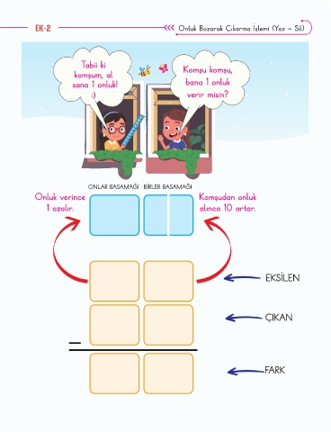 EK-2 Onluk Bozarak Çıkarma İşlemi (Yaz - Sil) Tabii ki Komşu komşu, komşum, al sana 1 onluk! bana 1 onluk : ) verir misin? ONLAR BASAMAĞI BİRLER BASAMAĞI Onluk verince Komşudan onluk 1 azalır. alınca 10 artar. EKSİLEN ÇIKAN FARK