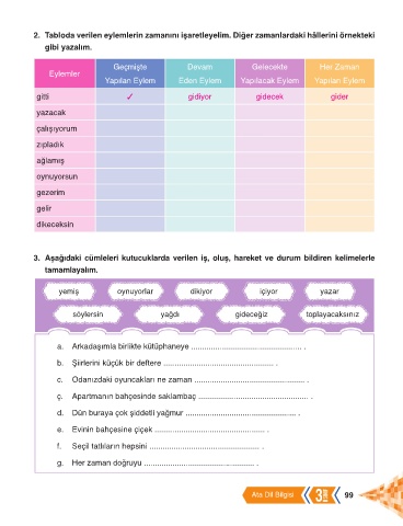 2. Tabloda verilen eylemlerin zamanını işaretleyelim. Diğer zamanlardaki hâllerini örnekteki