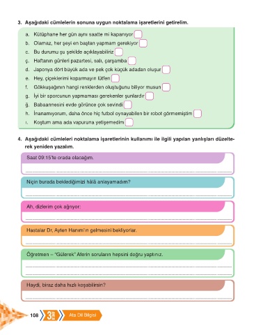 3. Aşağıdaki cümlelerin sonuna uygun noktalama işaretlerini getirelim.