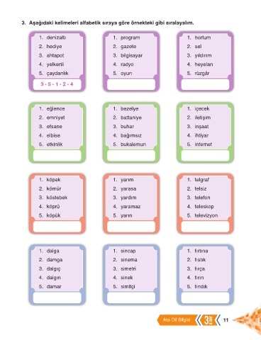 3. Aşağıdaki kelimeleri alfabetik sıraya göre örnekteki gibi sıralayalım.