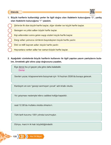 1. Büyük harflerin kullanıldığı yerler ile ilgili doğru olan ifadelerin kutucuğuna “D”, yanlış