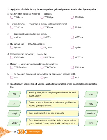 2. Aşağıdaki cümlelerde boş bırakılan yerlere gelmesi gereken kısaltmaları işaretleyelim.