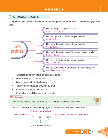 Ağzımızın bir hareketiyle çıkan ses veya ses gruplarına hece denir. Türkçede altı çeşit hece