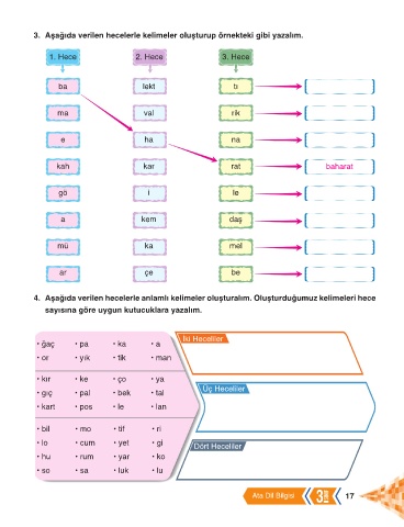3. Aşağıda verilen hecelerle kelimeler oluşturup örnekteki gibi yazalım.