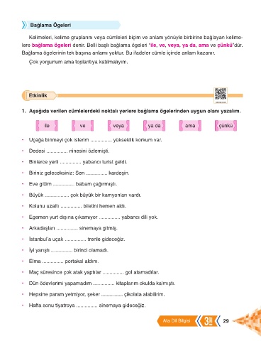 lere bağlama ögeleri denir. Belli başlı bağlama ögeleri “ile, ve, veya, ya da, ama ve çünkü”dür.