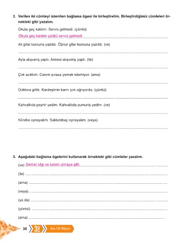 3. Aşağıdaki bağlama ögelerini kullanarak örnekteki gibi cümleler yazalım.