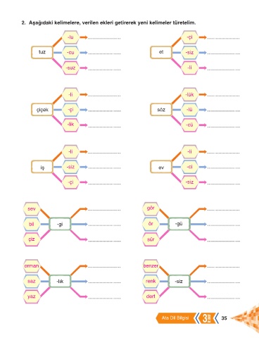 2. Aşağıdaki kelimelere, verilen ekleri getirerek yeni kelimeler türetelim.