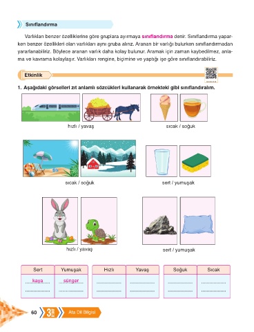 1. Aşağıdaki görselleri zıt anlamlı sözcükleri kullanarak örnekteki gibi sınıflandıralım.