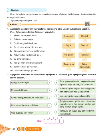 1. Aşağıdaki atasözlerinin numaralarını konularına göre uygun kutucuklara yazalım.