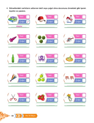 4. Görsellerdeki varlıkların adlarının tekil veya çoğul olma durumunu örnekteki gibi işaret-
