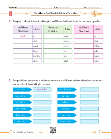 A. Aşağıdaki adların önüne örnekteki gibi, varlıkların özelliklerini belirten kelimeler yazalım.