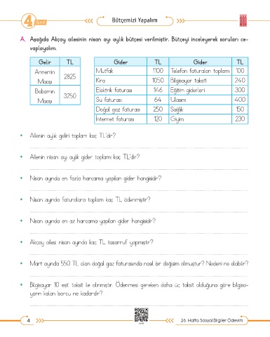 A. Aşağıda Akçay ailesinin nisan ayı aylık bütçesi verilmiştir. Bütçeyi inceleyerek soruları ce-