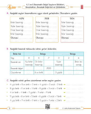 A. Aşağıdaki sayıları basamaklarına uygun olarak yerleştirelim. Okunuşlarını yazalım.