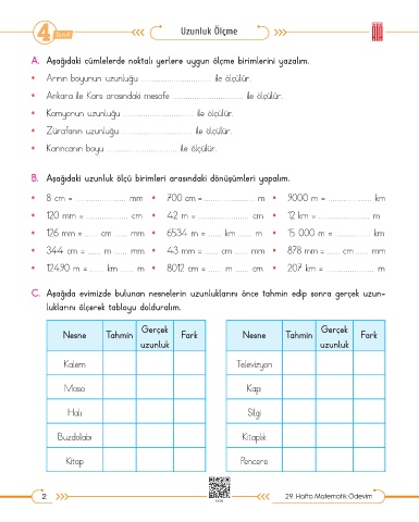 A. Aşağıdaki cümlelerde noktalı yerlere uygun ölçme birimlerini yazalım.