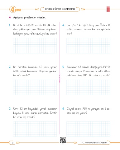 1. Bir kitabın kalınlığı 30 mm’dir. Kitaplık rafına 4. Her gün 7 km yürüyüş yapan Özlem 14