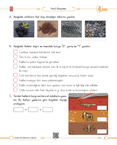 A. Aşağıdaki varlıkların fosil olup olmadığını altlarına yazalım.