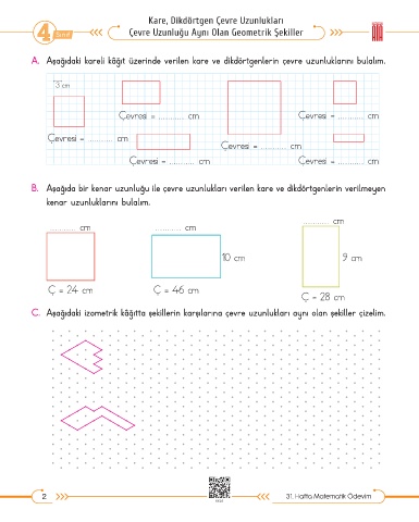 B. Aşağıda bir kenar uzunluğu ile çevre uzunlukları verilen kare ve dikdörtgenlerin verilmeyen