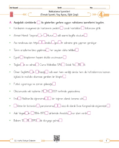 A. Aşağıdaki cümlelerde ile gösterilen yerlere uygun noktalama işaretlerini koyalım.