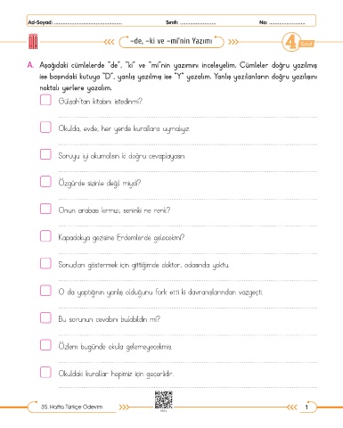 A. Aşağıdaki cümlelerde “de”, “ki” ve “mi”nin yazımını inceleyelim. Cümleler doğru yazılmış