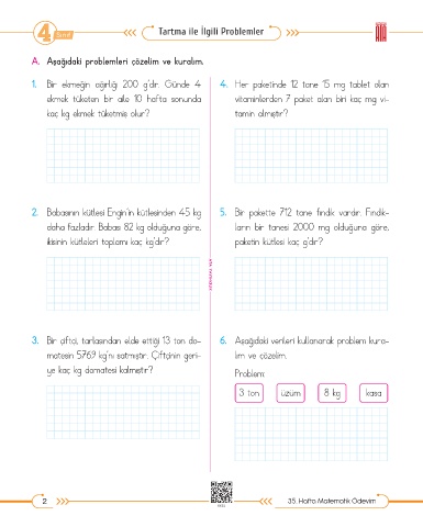 3. Bir çiftçi, tarlasından elde ettiği 13 ton do- 6. Aşağıdaki verileri kullanarak problem kura-