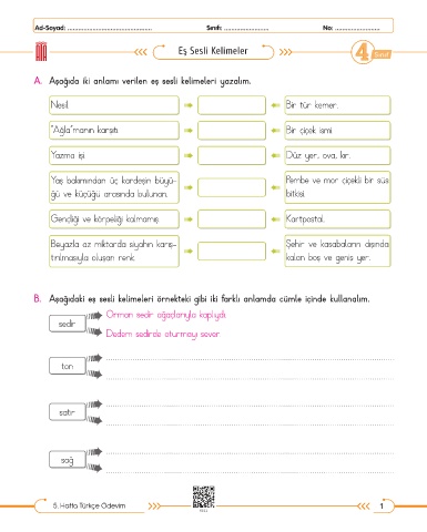 A. Aşağıda iki anlamı verilen eş sesli kelimeleri yazalım.