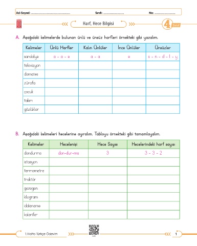 A. Aşağıdaki kelimelerde bulunan ünlü ve ünsüz harfleri örnekteki gibi yazalım.