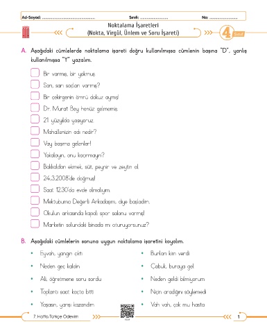 B. Aşağıdaki cümlelerin sonuna uygun noktalama işaretini koyalım.