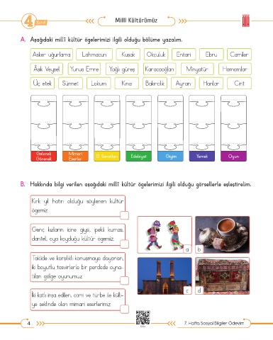 B. Hakkında bilgi verilen aşağıdaki millî kültür ögelerimizi ilgili olduğu görsellerle eşleştirelim.
