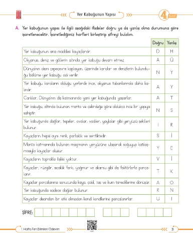 A. Yer kabuğunun yapısı ile ilgili aşağıdaki ifadeler doğru ya da yanlış olma durumuna göre