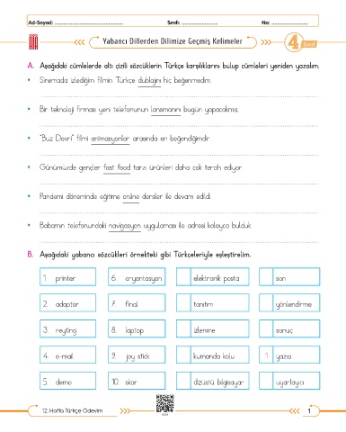 A. Aşağıdaki cümlelerde altı çizili sözcüklerin Türkçe karşılıklarını bulup cümleleri yeniden yazalım.