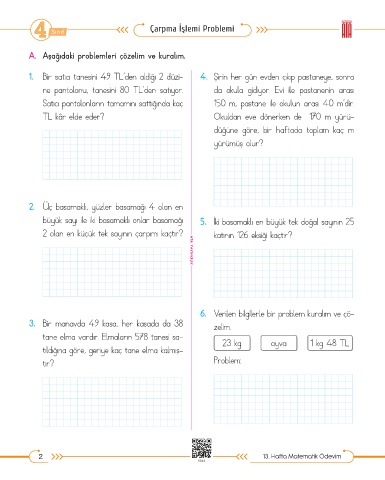 1. Bir satıcı tanesini 49 TL’den aldığı 2 düzi- 4. Şirin her gün evden çıkıp pastaneye, sonra