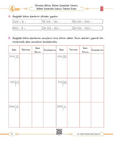 B. Aşağıdaki bölme işlemlerinin sonuçlarını önce tahmin edelim. Sonra işlemleri yaparak tah-