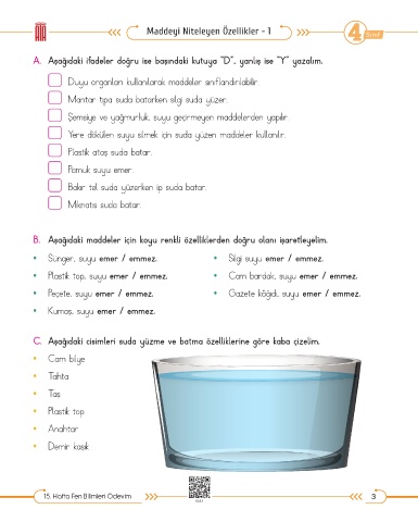 C. Aşağıdaki cisimleri suda yüzme ve batma özelliklerine göre kaba çizelim.