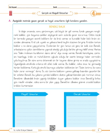 A. Aşağıdaki metinde geçen gerçek ve hayal unsurlarını ilgili kutulara yazalım.