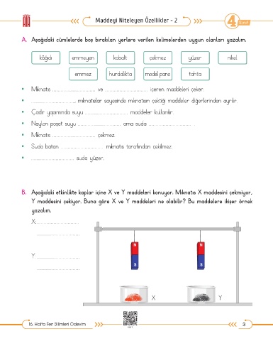 B. Aşağıdaki etkinlikte kaplar içine X ve Y maddeleri konuyor. Mıknatıs X maddesini çekmiyor,