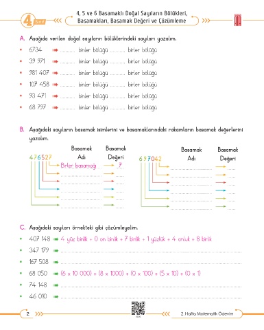 B. Aşağıdaki sayıların basamak isimlerini ve basamaklarındaki rakamların basamak değerlerini