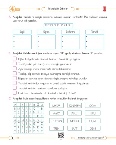 A. Aşağıdaki tabloda teknolojik ürünlerin kullanım alanları verilmiştir. Her kullanım alanına