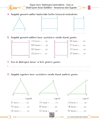 B. Aşağıdaki geometrik şekillerin kenar uzunluklarını cetvelle ölçerek yazalım.