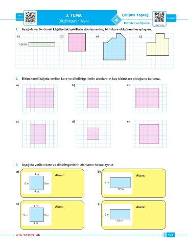 3. Aşağıda verilen kare ve dikdörtgenlerin alanlarını hesaplayınız.