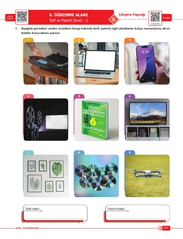 1. Aşağıda görselleri verilen ürünlerin hangi haklarla (telif, patent) ilgili olduklarını bulup numaralarını ait ol-