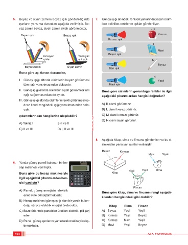 5. Beyaz ve siyah zemine beyaz ışık gönderildiğinde 7. Güneş ışığı altındaki renkleri yanlarında yazan cisim-