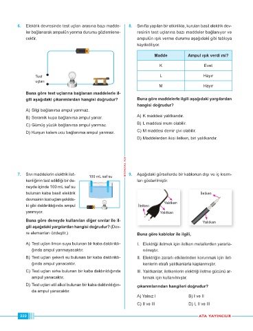 6. Elektrik devresinde test uçları arasına bazı madde- 8. Sınıfta yapılan bir etkinlikte, kurulan basit elektrik dev-